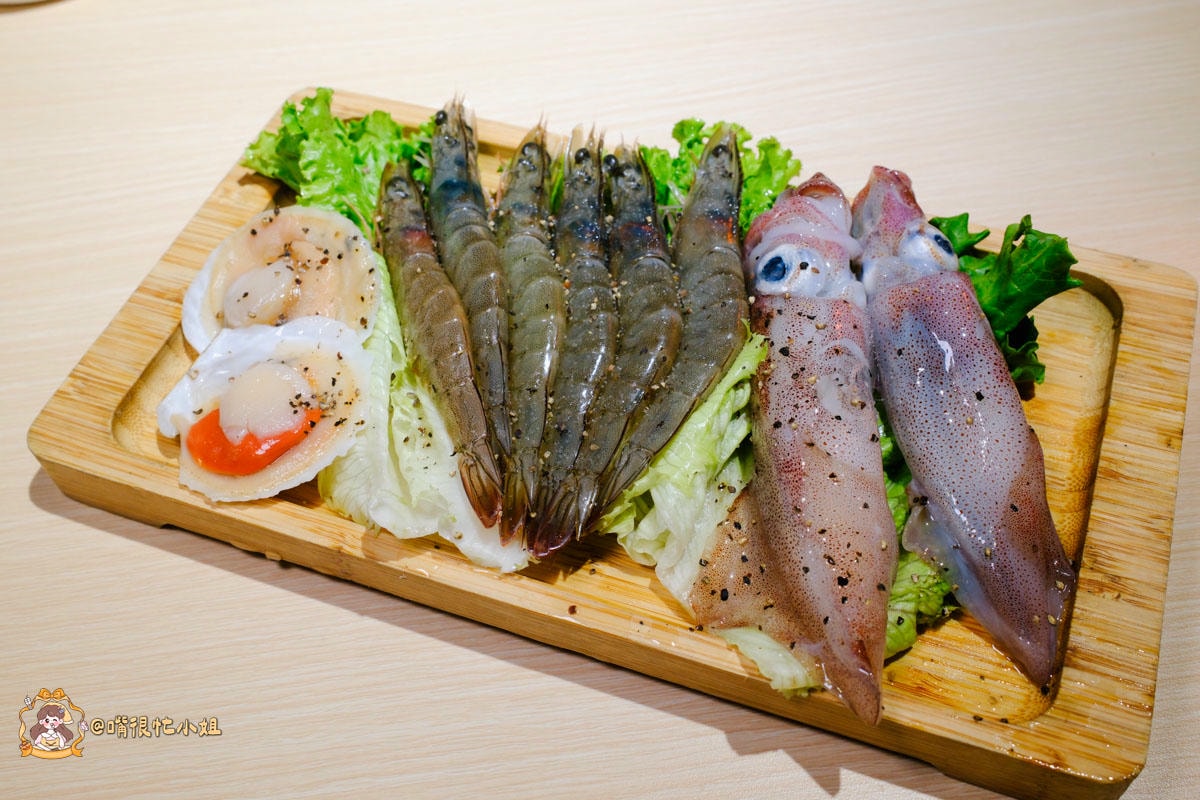 這一盤海鮮包括扇貝、蝦、花枝。蝦肉吃起來彈性十足、緊實,外殼輕輕剝開就見粉嫩蝦肉,鮮甜味明顯;花枝稍微烤過會有脆彈,不會過老;扇貝咬下去還嚐得到海水的鮮味。