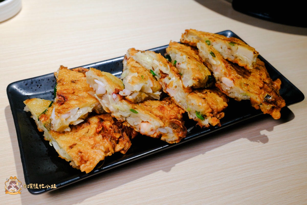 海鮮煎餅外皮略帶金黃色澤,煎得酥脆卻不焦,裡面料非常紮實,有蝦仁、花枝切丁、蔬菜絲等。咬下一口,酥皮與內餡的對比明顯:酥脆外殼、濕潤內層,海鮮的鮮味混著麵漿的香氣不會打架,是一道很適合拿來分享的前菜。