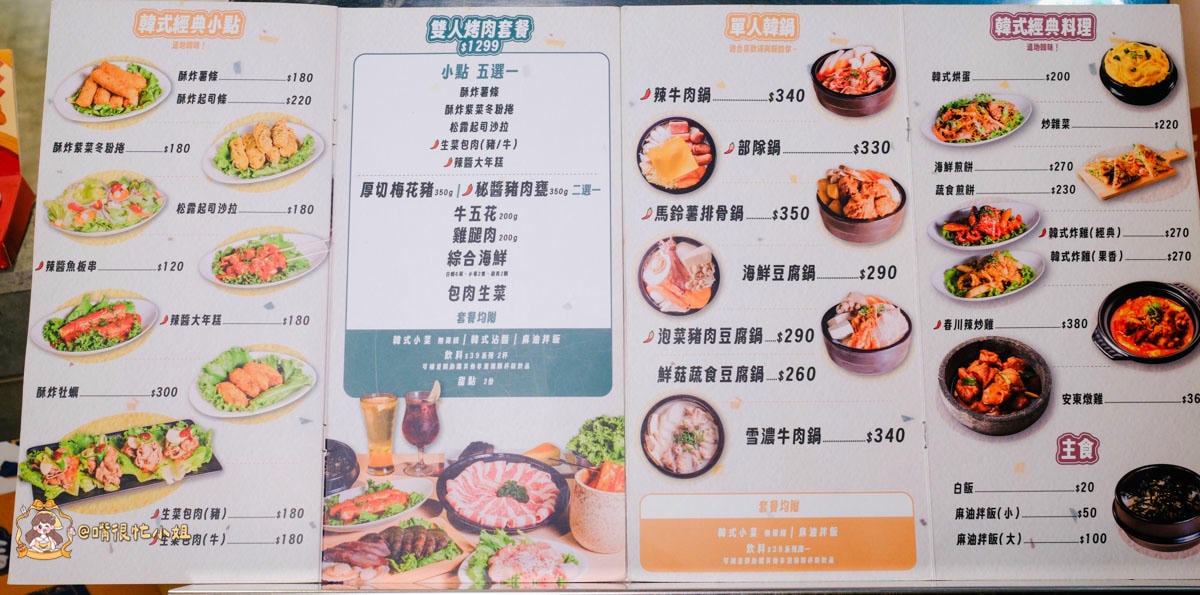 雖然以單點價位來看比起一般韓式料理店稍微高一些,但分量跟用料算實在;其中雙人套餐 $1,299 的組合真的夠豐盛,尤其還附小菜無限續,吃完會覺得值回票價;所以一個人吃可能會覺得偏貴,但多人分食就剛剛好。