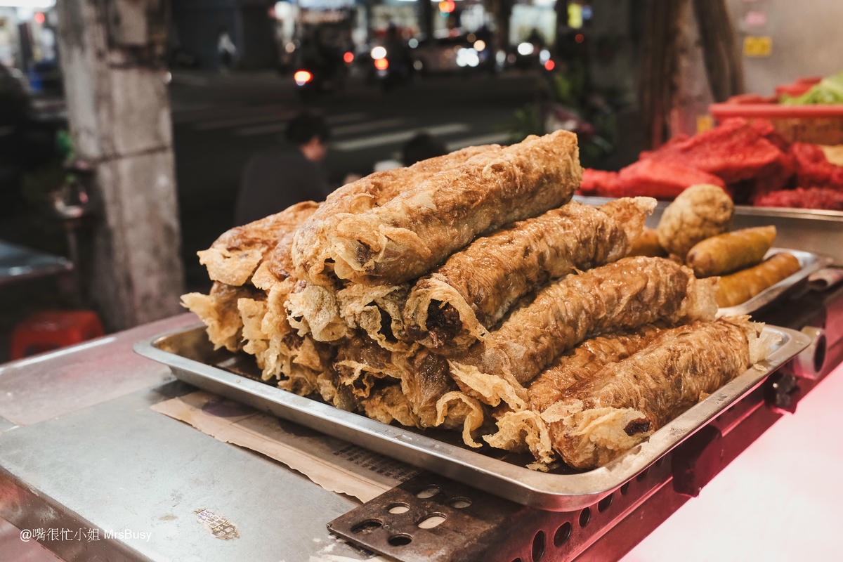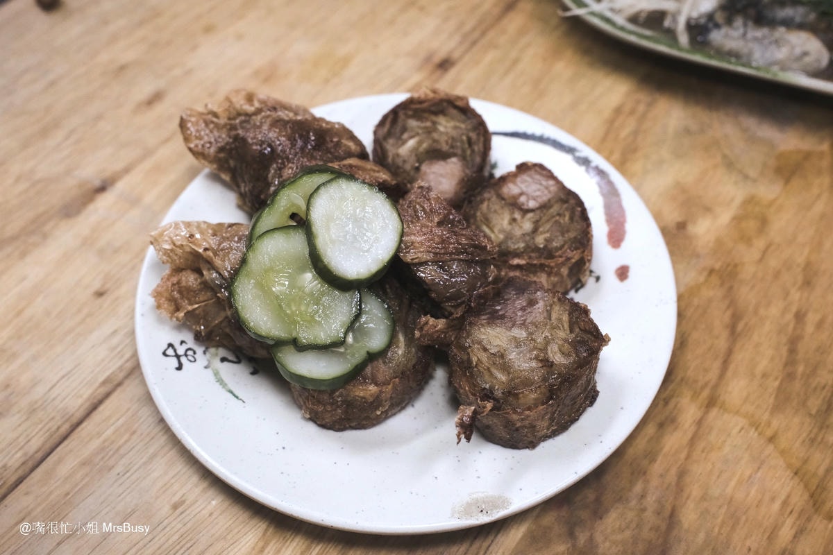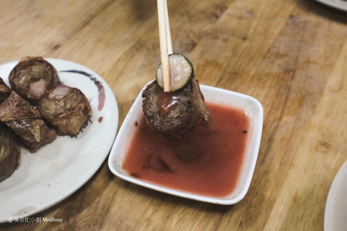 這個也是必點之一;雞捲是店家每天手工現包,內餡是以豬肉和洋蔥製成,薄脆的外皮包裹著滿滿的肉餡,口感紮實又多汁。每一口都能嚐到豬肉的鮮甜與洋蔥的香氣,推薦一定要搭配他們特調的甜辣醬,無論是配著香菇肉粥一起吃,還是搭配冰涼啤酒,都超級對味!