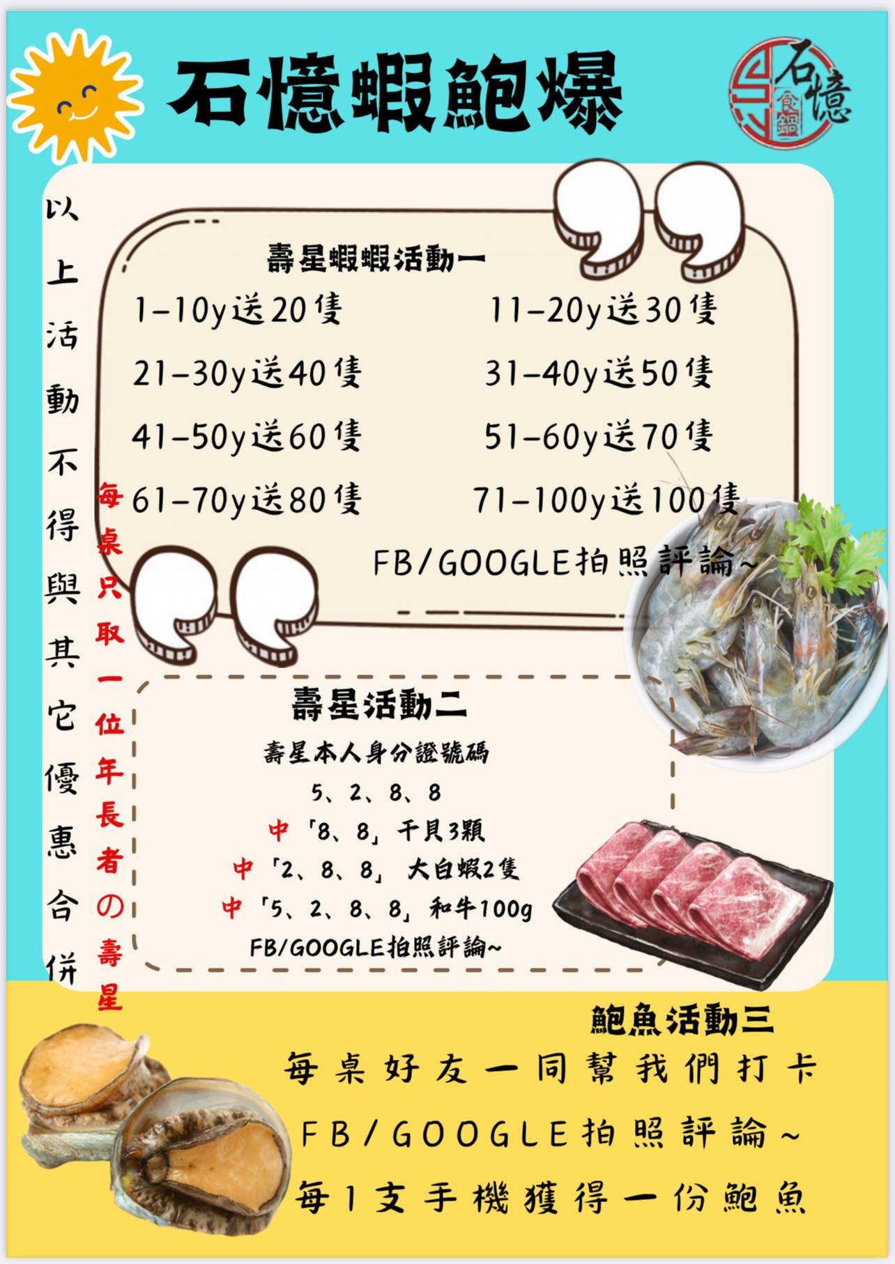 石憶食鍋不只餐點澎湃,還很會營造「儀式感」。如果是當月壽星,出示證件就能拿到「對應年齡數量的蝦」,對中號碼還可以獲得海鮮加料,超可愛又實在!生日聚餐必衝!而且店家也不時會推出節慶活動,像是母親節送龍蝦、中號福碼抽鮑魚⋯⋯詳情可以參照店家的 FB粉專