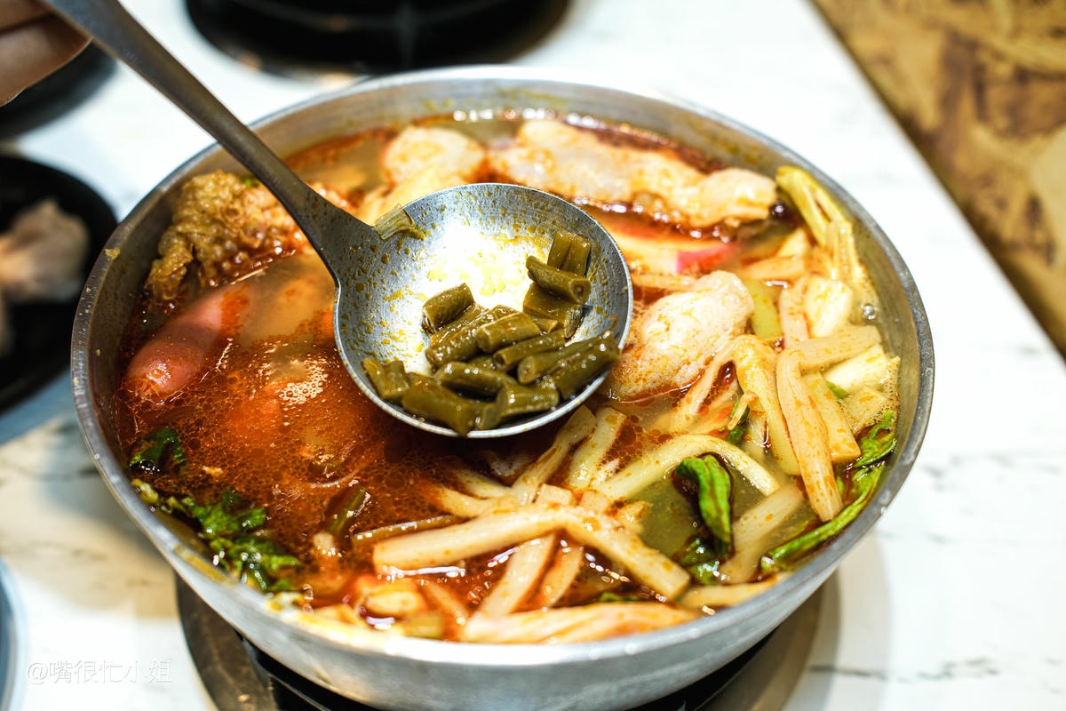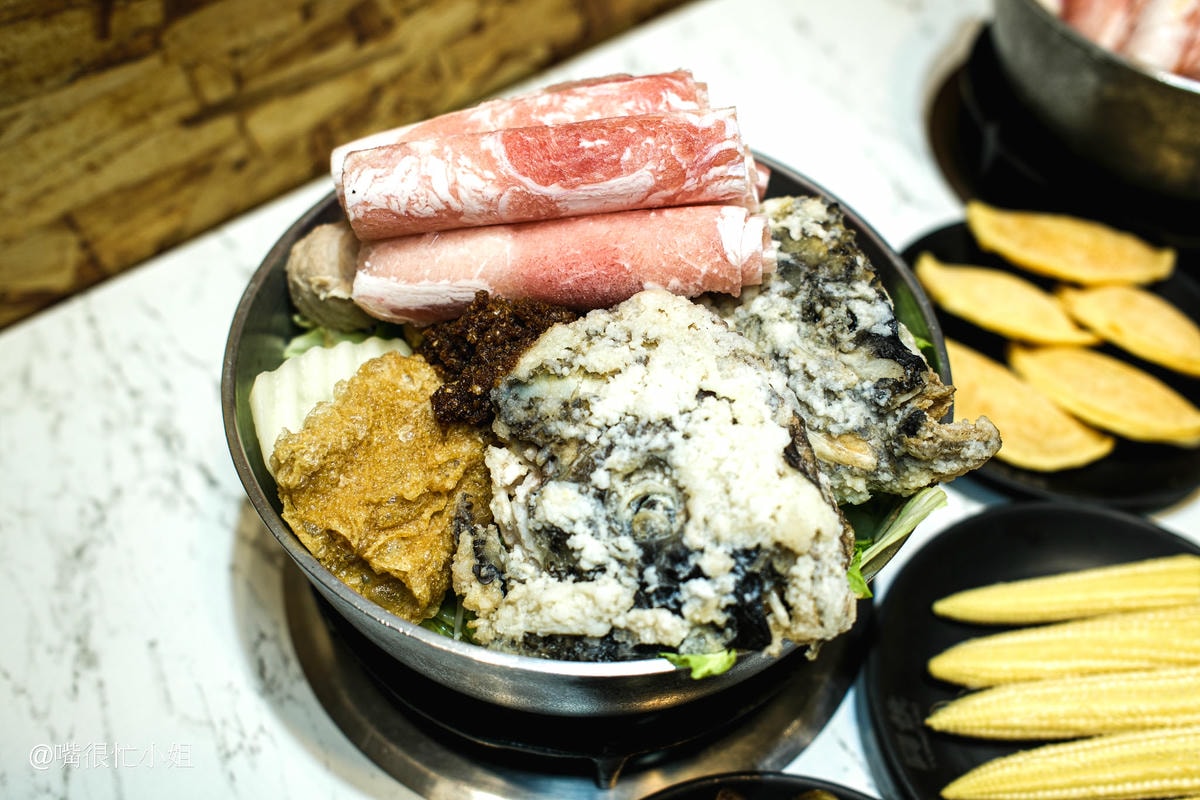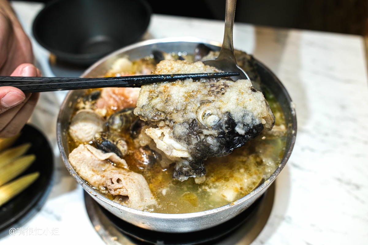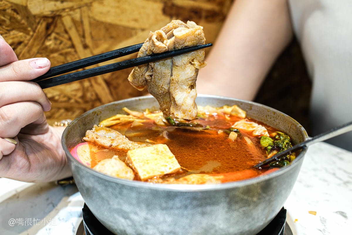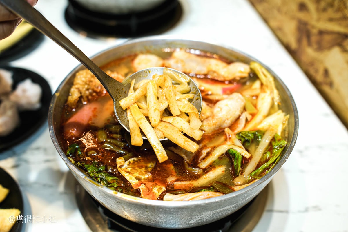 小火鍋竟然能吃到砂鍋魚頭!用鮮魚頭加沙茶熬煮的湯底很濃郁,魚頭處理得很乾淨沒有腥味,炸過的外皮吸飽湯汁後帶點膠質感,魚肉滑嫩,配上鍋底大量的高麗菜與肉片、火鍋料等配料,口感更豐富;私心覺得加王子麵跟冬粉都很好吃!
