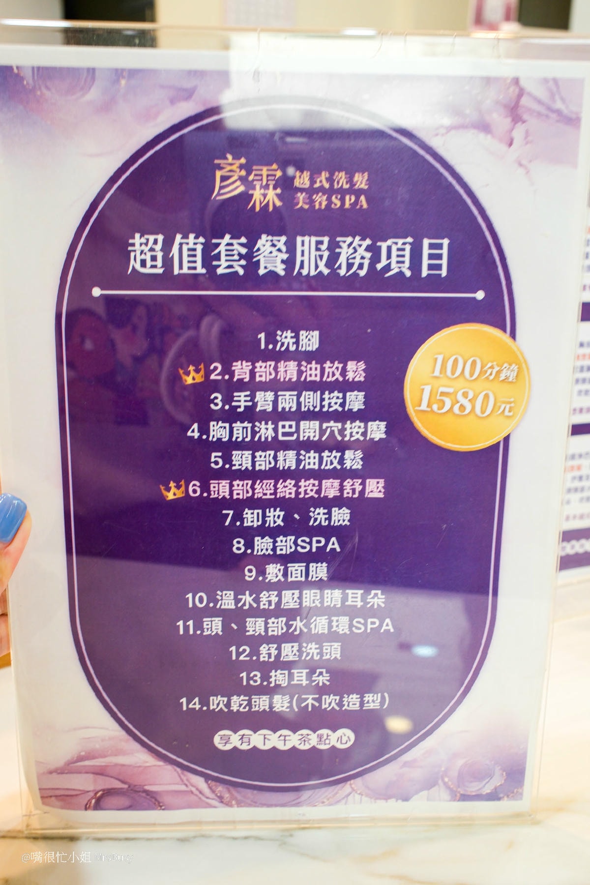 今天體驗的是彥霖越式洗髮最主打的套餐,100 分鐘享受從頭到腳的SPA,只要$1,580。