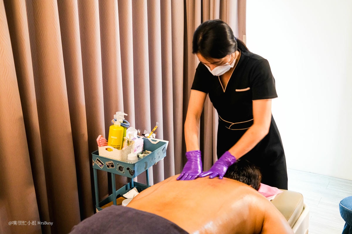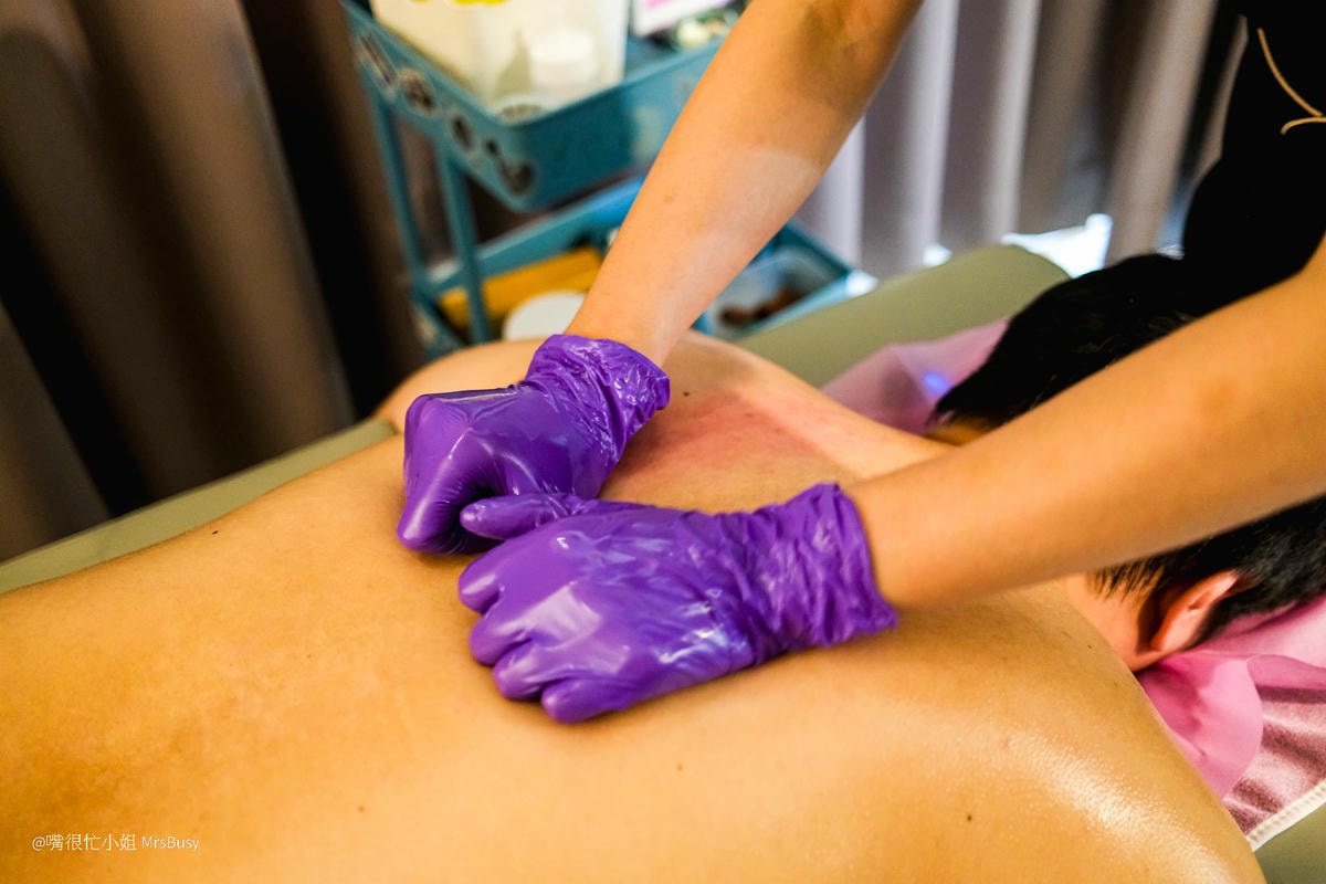按摩師會將精油塗抹於背部、肩頸,過程中會根據肌肉緊繃的狀況以及忍受力去調整按摩的力道,整體手法很細膩,很有效的紓解肩頸僵硬與壓力。