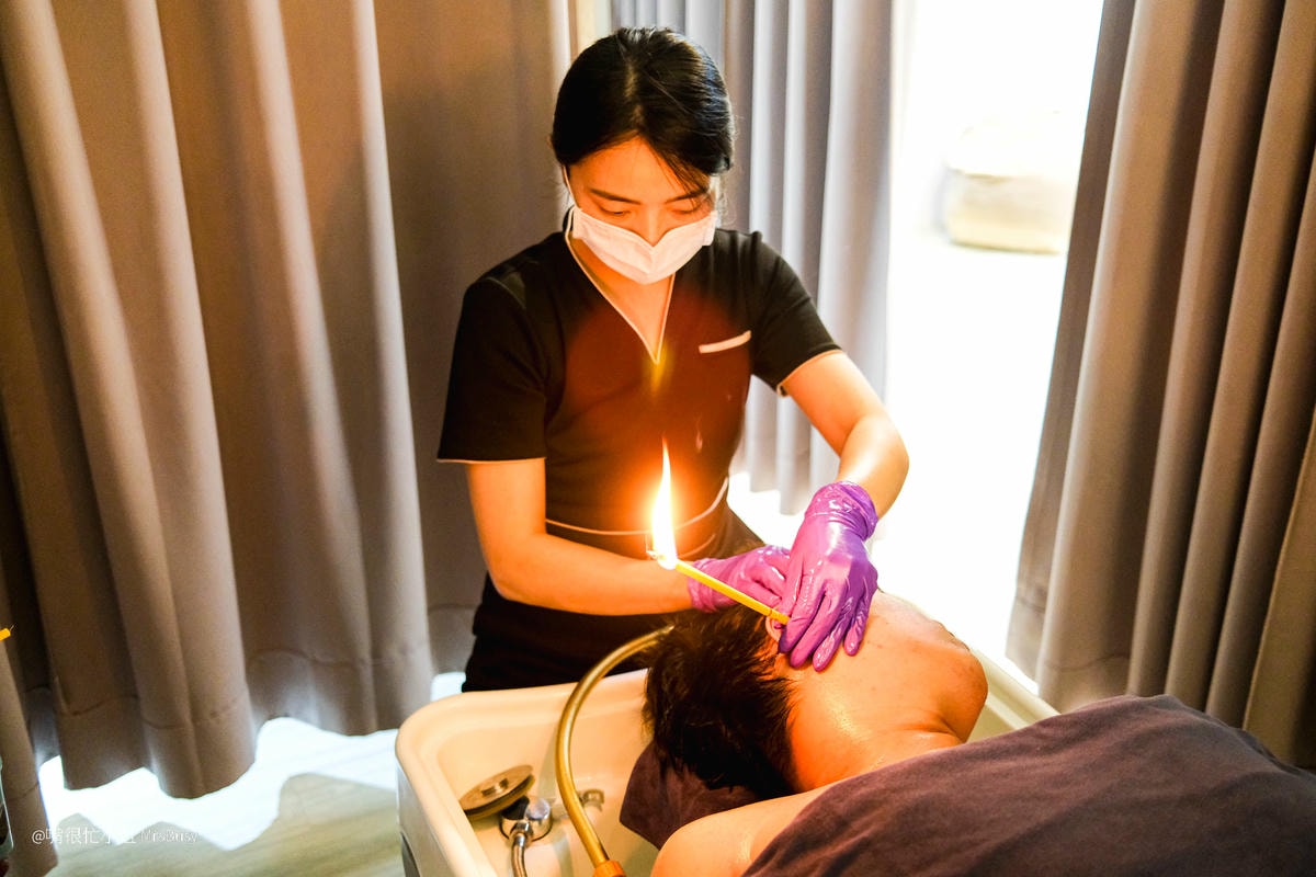 按摩師會點燃耳燭插於耳道上方,燃燒時耳朵會聽到「滋滋」的白噪音聲,溫熱的蒸氣灌入耳內與頭部,可以有效去除濕氣,促進循環;掏耳過程中使用了多種工具:如羽毛棒、螺旋棒、按摩棒,很細緻的掏除耳垢,友人說:「是非常極致的享受」!